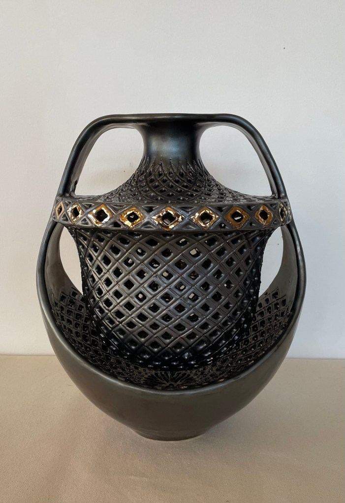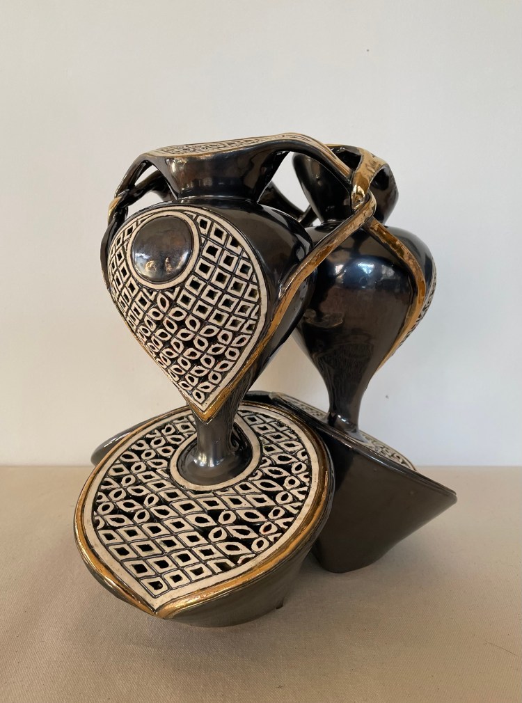 The inspiration for my forms come from vases of the Naqada III period in Egypt from 3200-3000 BCE. The strong lines and bold shapes of that period are my favorite. Their delicate finials and small bases embody an elegance, lightness, and strength that are still unmatched for me. My carvings are inspired by artifacts of water jug filters made between 900-1200 ACE in Fustat, Egypt. Although the carved designs were made for functional reasons, to filter out river sediment, the beauty of geometric, floral, and animal designs are prevalent in Islamic Arts and adorned many day-to-day objects what was particularly poetic about them was that only those drinking could see the designs: it embodied a principle emphasizing inner beauty rather than the external and emphasized an individual contemplative experience. Searching for ways to bring these ancient carvings and their narratives back to life has become one of my artistic challenges – I always want my work to feel Egyptian and build on that rich cultural history. I believe the act of making is in itself an act of devotion and meditation to the beauty present and possible in the world. I believe art is a testimony to what needs to be known, and held onto.