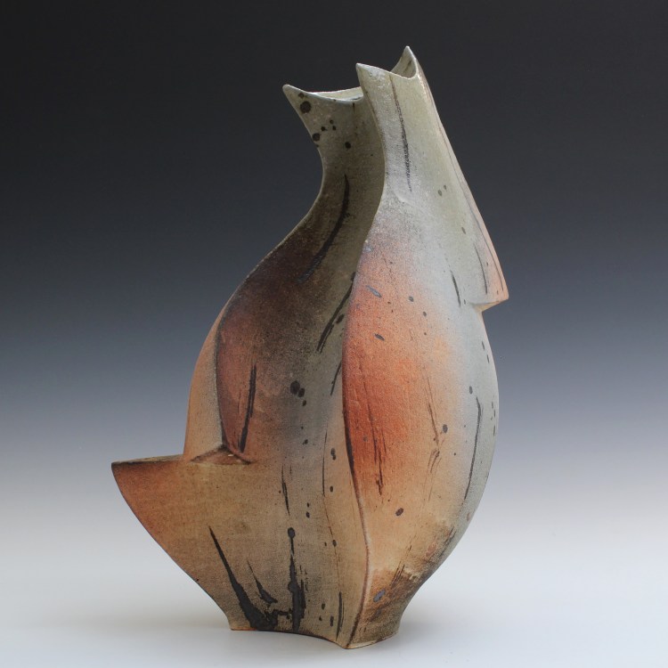 w 11″ x d 11″ x h 17″ NC stoneware, Handbuilt, WIld Clay slips, Red Iron OX, Wood Ash, Wood Fired, Cone 11
